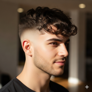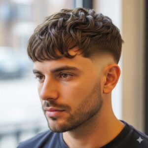Pairing a skin fade with a curly fringe creates a striking contrast. The fade keeps the sides ultra-clean, while the curls on top add personality. It’s a stylish option for men who want sharp edges with a playful top.