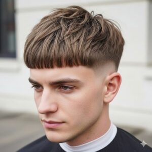 This style brings a strong, straight-across fringe that looks bold and defined. It’s sharp, confident, and pairs well with clean fades on the sides. Barbers love this because it creates a strong frame for the face and gives a youthful look.
